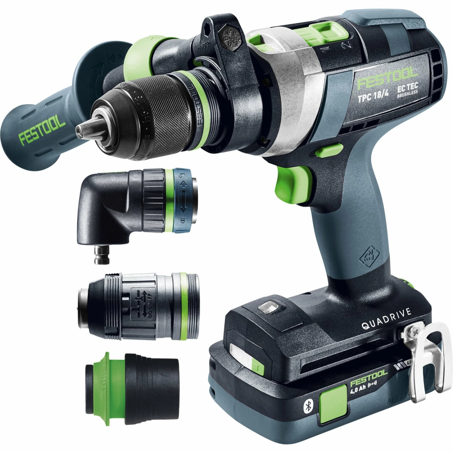 - Kraftvoll. Vielseitig. Mit 4 Gängen für jede Anwendung. Mit dem besten Schaltkonzept, das ihr je bedient habt. Ganz gleich, ob in Holz, Metall oder dank zuschaltbarem Axialschlag auch in Mauerwerk: Der TPC ist extrem hart im Nehmen und verfügt mit seinem bürstenlosen EC-TEC Motor über enorme Belastbarkeit und Ausdauer. Zahlreiche Vorsätze, kombiniert mit perfekt abgestimmtem Zubehör, machen den QUADRIVE zu einem unübertroffenen Schlagbohrschrauber für unterschiedlichste Einsatzmöglichkeiten. Und gefährliches Verdrehen des Handgelenks bei plötzlichem Blockieren des Einsatzwerkzeugs? Unser intelligenter KickbackStop minimiert das Risiko, dass es so weit kommt. Probiert ihn aus: den besten Schlagbohrschrauber, den Festool je gebaut hat!