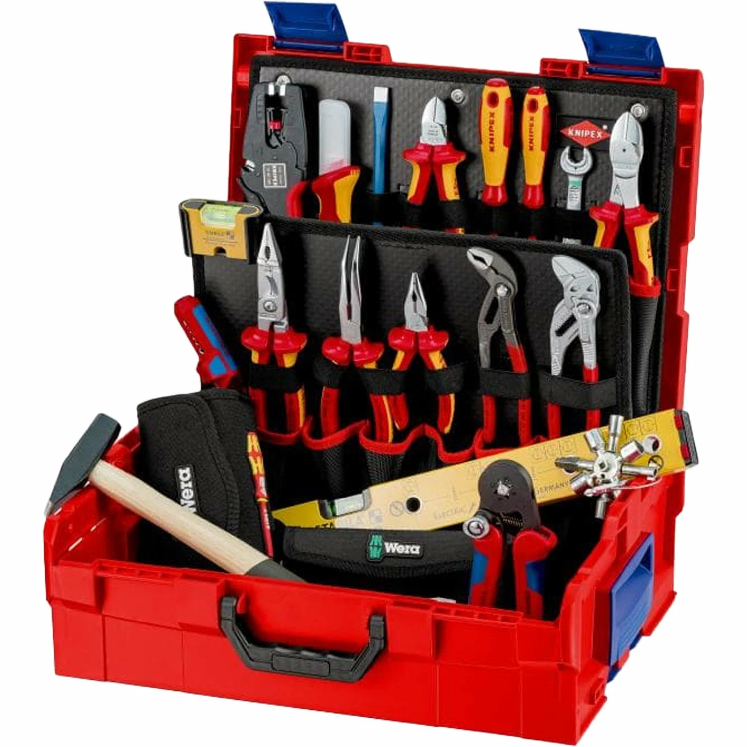 - Bestückt mit 14 KNIPEX-Werkzeugen, insgesamt 63 Markenwerkzeugen, teilweise VDE-geprüft nach DIN EN 60900